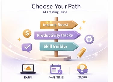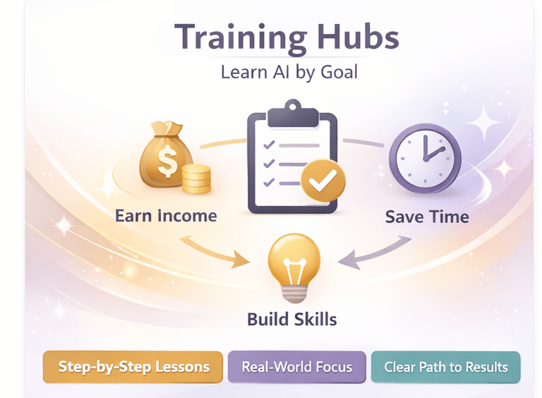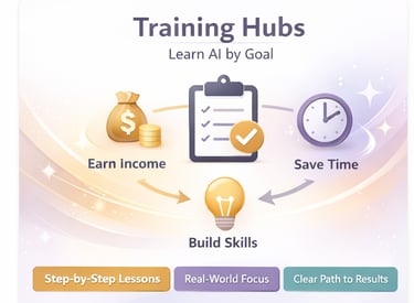Our Training Hubs organize AI learning by real goals—helping you earn, create, and grow with clarity instead of confusion.